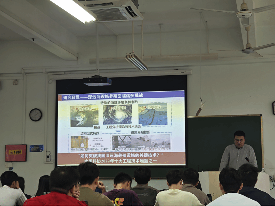 首日讲座,赵云鹏教授以“向海洋要食物”的国家战略为引,为同学们描绘了海洋资源开发利用的广阔前景。海洋作为潜力巨大的“蓝色粮仓”,其现代海洋牧场建设是推动渔业转型升级、实现高质量发展的重要突破口。在此背景下,他带领同学们深入剖析了“桁架式网箱”这一核心装备,细致讲解了其水动力特性、结构稳性与强度,并进行了成本效益评估,清晰地勾勒出科技创新驱动产业发展的完整链条。