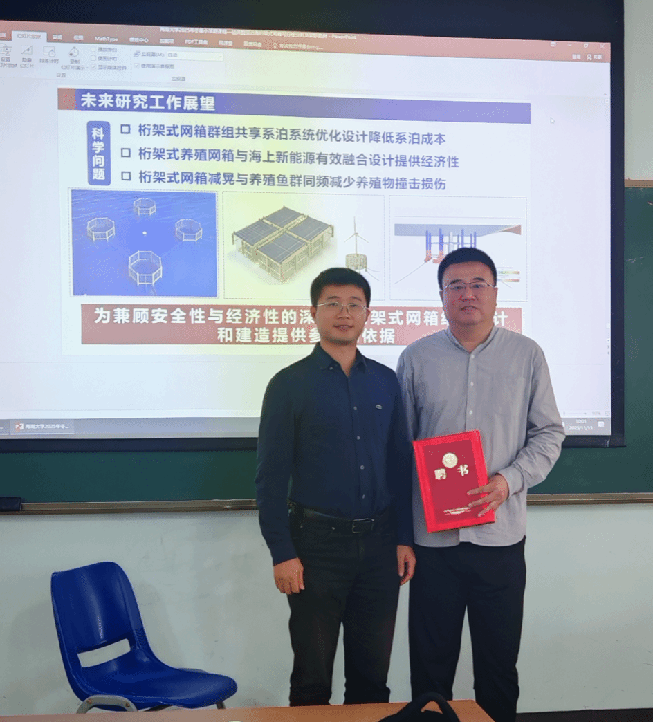 2025年11月15日至16日,大连理工大学赵云鹏教授应邀为jdb电子游戏官方网站开展为期两天的《深远海养殖关键装备水动力特性研究与技术创新》专题讲座。讲座在jdb电子游戏官方网站海甸校区4号教学楼105教室举行,开班仪式由学院副院长任年鑫教授(首日)与郑振钧副研究员(次日)共同主持。任年鑫副院长代表学院对赵云鹏教授表示热烈欢迎,并现场颁发了专家聘书。本次活动吸引了校内师生及海南本地企业代表的积极参与。
