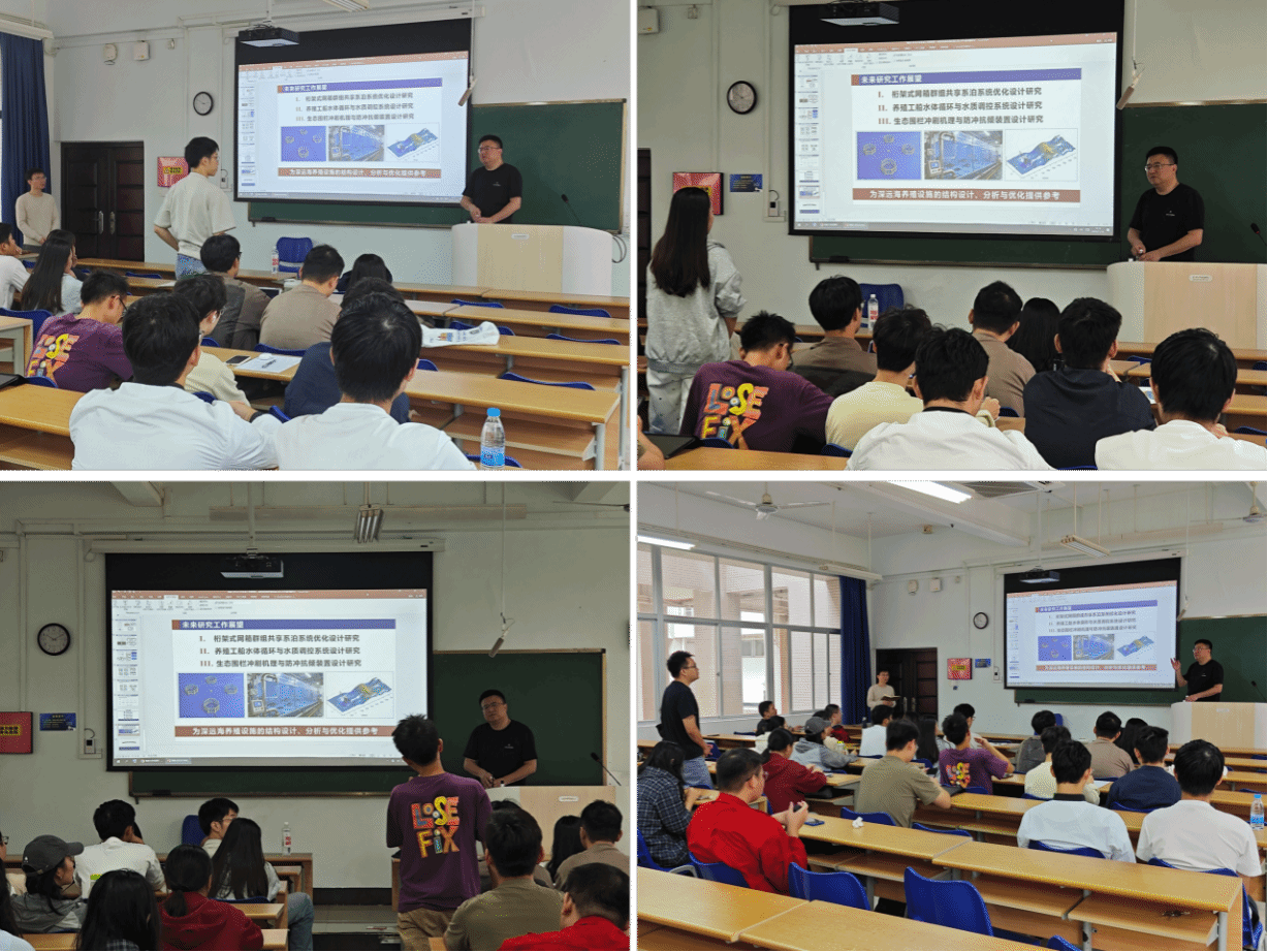次日讲座,赵云鹏教授系统对比和梳理了多种主流海洋牧场方案的技术路径与发展现状,包括桁架式深远海网箱、移动式养殖工船以及大型生态工程围栏。通过对这“三大路径”的优劣与适用场景的对比,同学们对产业全貌有了清晰认知。讲座尾声,教授以前瞻性的眼光,提出了未来研究工作的展望,为有志于此领域的学子指明了前沿的探索方向。