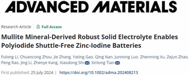 近日,海洋科学与工程学院史晓东副教授所在团队在能源化学领域顶级期刊Advanced Materials (IF=27.3)发表题为“Mullite mineral-derived robust solid electrolyte enables polyiodide shuttle-free zinc-iodine batteries”的研究论文。jdb电子游戏官方网站李富龙硕士(研一)、周传聪博士(博三)和张杰硕士(研二)为论文共同第一作者,jdb电子游戏官方网站史晓东副教授和田新龙教授为论文共同通讯作者,jdb电子游戏官方网站海洋科学与工程学院为论文唯一通讯单位。