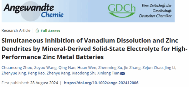近日,海洋科学与工程学院史晓东副教授所在团队在能源化学领域顶级期刊Angewandte Chemie International Edition (IF=16.1)发表题为“Simultaneous Inhibition of Vanadium Dissolution and Zinc Dendrites by Mineral-Derived Solid-State Electrolyte for High-Performance Zinc Metal Batteries”的研究论文。周传聪博士为论文第一作者,史晓东副教授和田新龙教授为论文通讯作者,jdb电子游戏官方网站海洋科学与工程学院为论文唯一通讯单位。