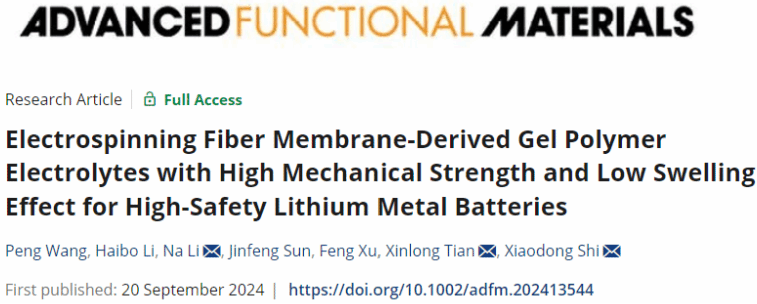 近日,海洋科学与工程学院史晓东副教授所在团队在能源化学领域顶级期刊Advanced Functional Materials发表题为“Electrospinning Fiber Membrane-Derived Gel Polymer Electrolytes with High Mechanical Strength and Low Swelling Effect for High-Safety Lithium Metal Batteries”的研究论文。河北科技大学王鹏副教授为论文第一作者,jdb电子游戏官方网站史晓东副教授和田新龙教授为论文通讯作者。