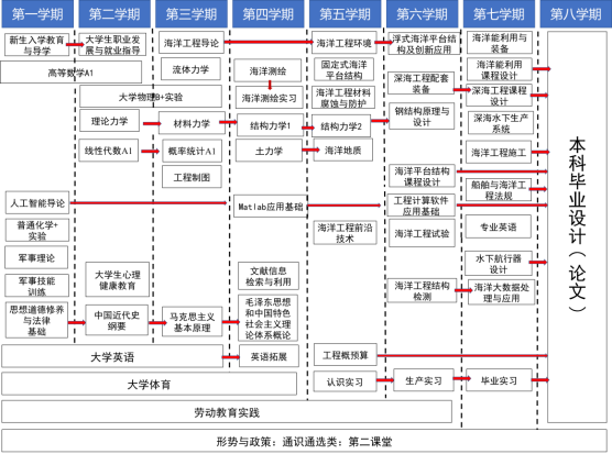 专业课程:海洋测绘、混凝土结构原理与设计、钢结构原理与设计、固定式海洋平台结构、浮式海洋平台结构、海洋能利用与装备、海洋岩土与地基基础、深海工程配套装备、海洋工程施工、工程概预算等。